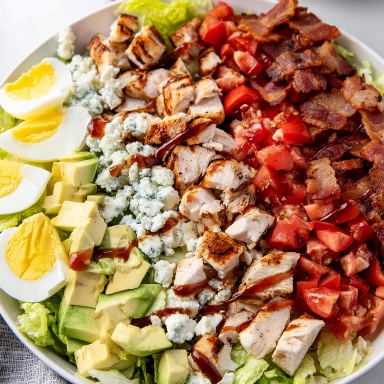 A traditional Cobb salad features the signature combination of romaine and iceberg lettuce, grilled chicken, crispy bacon, hard-boiled eggs, ripe avocado, diced tomatoes, and blue cheese arranged in distinct rows. The classic red wine vinaigrette dressing ties these ingredients together. This specific combination was created at the Brown Derby restaurant in Hollywood in the 1930s.