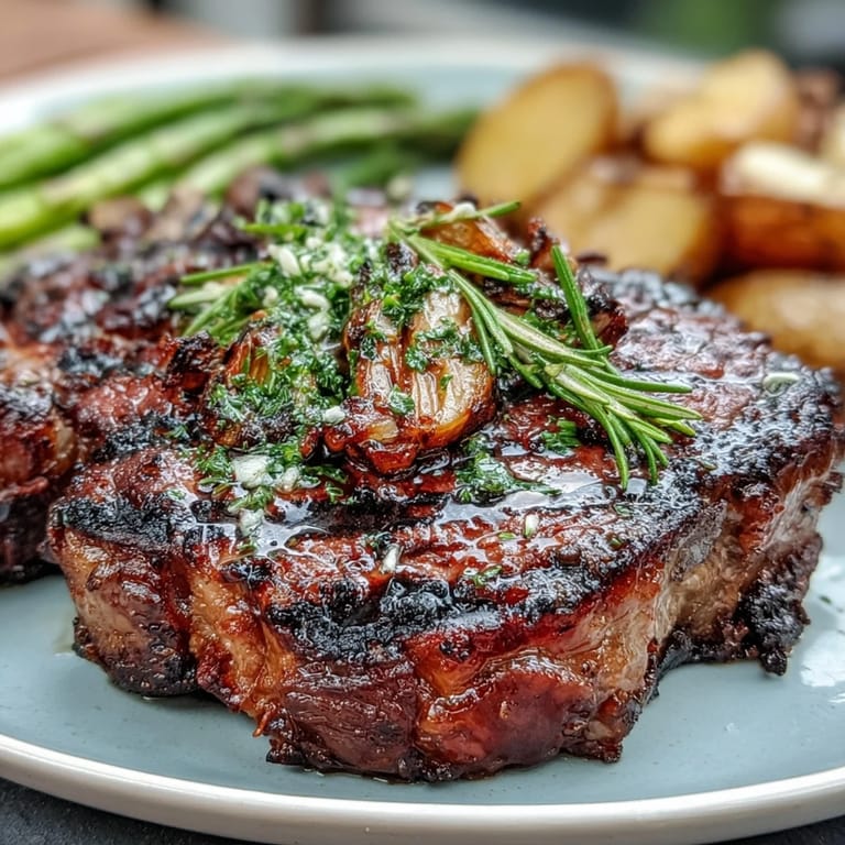 Pin it Experience the ultimate steakhouse dinner at home with this succulent grilled bone-in rib eye. Perfectly seasoned and infused with aromatic rosemary and garlic, this dish is served with buttered parsley potatoes and charred asparagus for a truly showstopping meal.