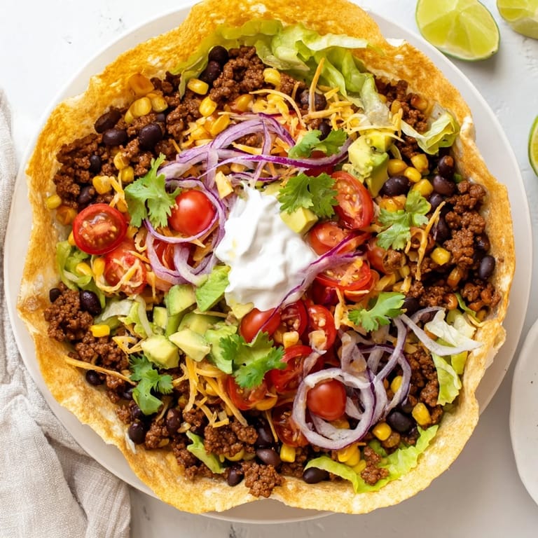Pin it The crunch of that first tortilla bowl still echoes in my kitchen memory—my Tuesday night dinner experiment that turned into a household legend. I was trying to recreate something from a restaurant we loved, and my kitchen smelled like cumin and anticipation. The tortillas kept sliding off the overturned bowls in the oven, and I may have burned my fingers twice getting them shaped just right. But when everyone bit into that crispy shell and the warm spiced beef hit the cool, crisp vegetables, I knew this was staying in rotation forever.