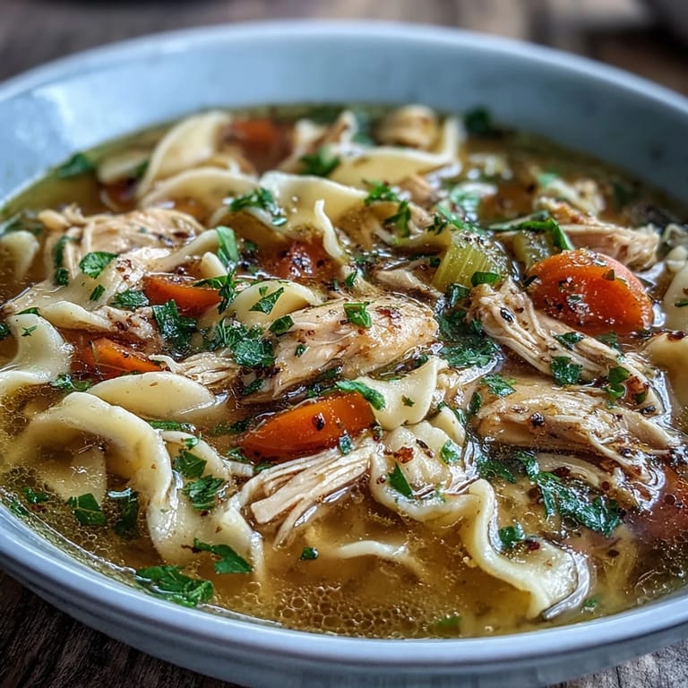 Pin it There's something about chicken and noodle soup that stops time. Years ago, my neighbor brought over a pot of this when I was stuck at home with a cold, and watching her ladle it into bowls while steam rose up between us felt like the most generous thing anyone had done in weeks. The way the broth coated the noodles, how the chicken fell apart at the gentlest touch—I understood then why this soup shows up in kitchens across continents, always the same in spirit but never quite the same twice.